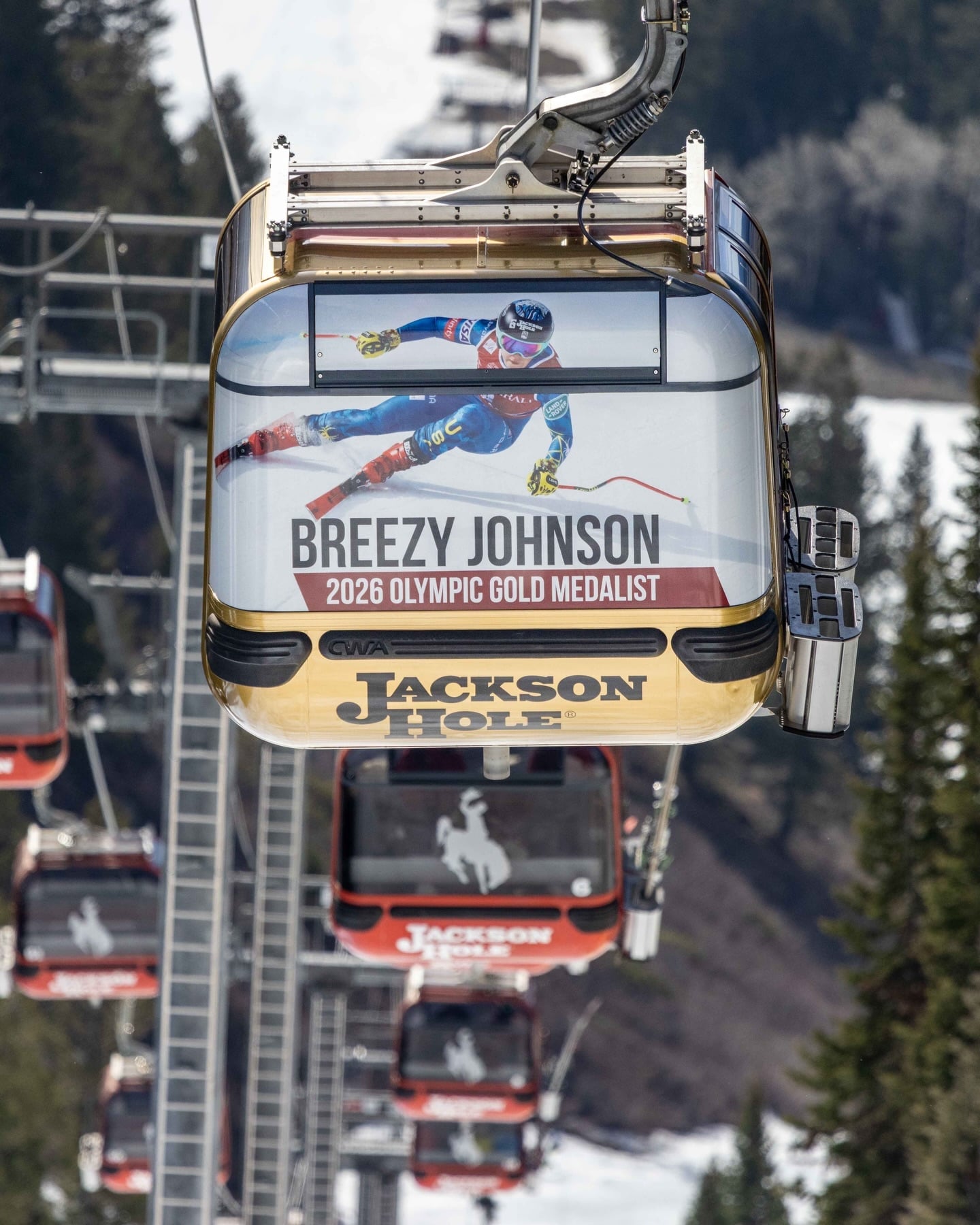 TETON VILLAGE, Wyo. — Cheers to Olympic gold medalist Breezy Johnson who now has her very own gold-wrapped gondola at Jackson Hole Mountain Resort. Breezy was born and raised in Jackson where she started skiing at Jackson Hole, racing for the Jackson Hole Ski and Snowboard Club until age 13.