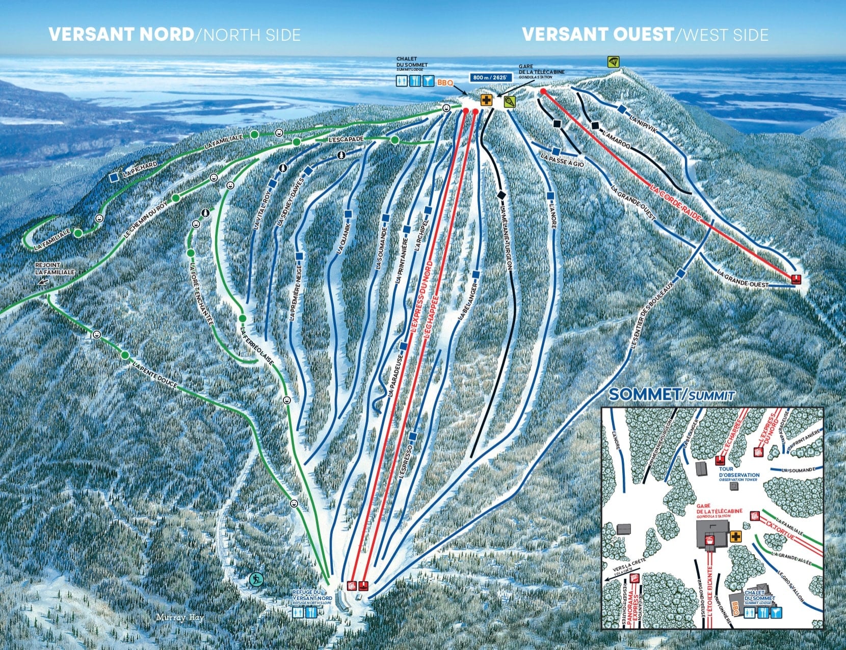 Lastly, the L’Express du Nord (North Express), a high-speed quad, will be replaced by a UNIG 6-CLD chairlift. This six-pack chairlift will have a ride time of 4.62 minutes, 67 chairs, and a capacity of 2,600 people per hour. This will replace both the North Express and L’Échappée surface lifts. The new lift line will be situated where L’Échappée is currently located. This will clear the La Paradeuse trail of lift towers. The top terminal will be situated south of its current location, making it easy to reach the expert terrain.