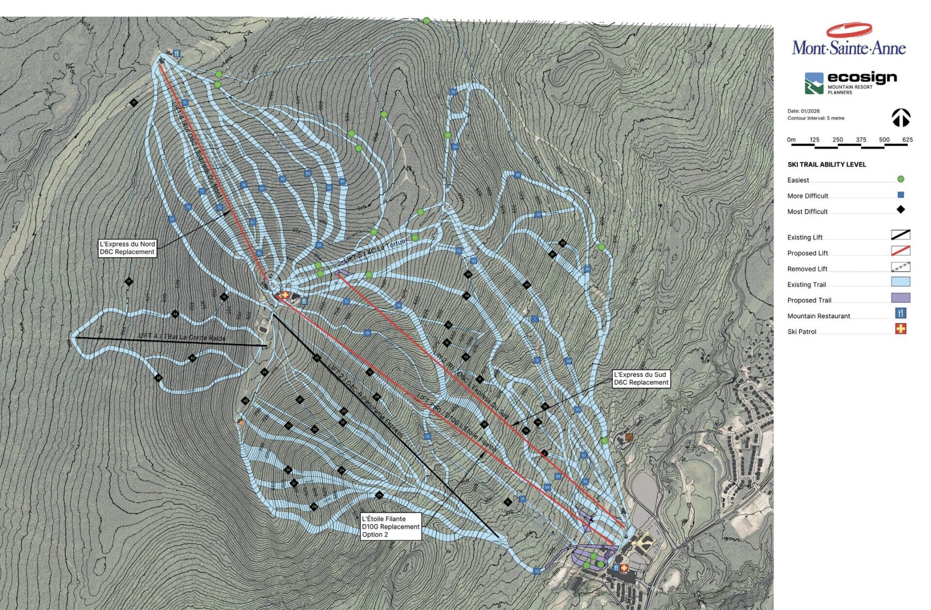 The three lifts will bring needed upgrades to the Quebec ski resort. The Express du Sud (Southern Express) is currently a high-speed quad with bubble covers. It’s planned to be replaced with a detachable high-speed six-pack bubble chairlift. This will replace Express du Sud and the Tortue chairlifts. Its new positioning will provide better access to other sectors of the mountain. The new Southern Express will have a ride time of 7.28 minutes, making it four times faster than its predecessor. The chairlift will have 97 carriers and can carry up to 2,400 people per hour.