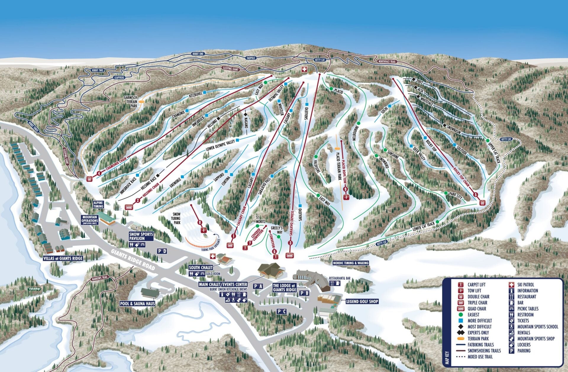 Giants Ridge is among the largest ski resorts in Minnesota and the region. The Minnesota ski resort features 35 trails across 202 acres, 5 lifts, and a vertical drop of 500 feet. Nordic skiers have many trails to explore, which wrap around the mountain. There are overnight options for guests, including the Lodge at Giants Ridge.