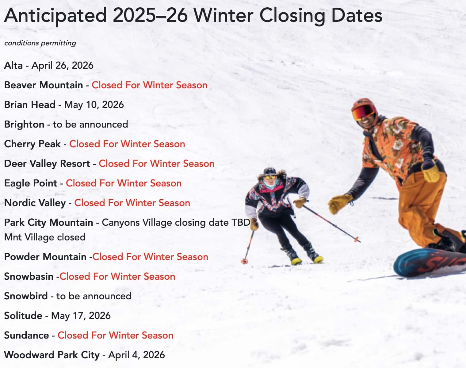 Here’s a quick rundown of projected closing dates for Utah’s ski resorts. Remember to confirm these before heading out the door as they are subject to change.