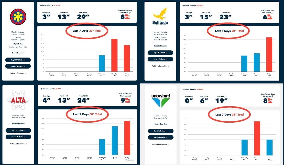 7 of Utah’s 15 resorts are still open and it looks like Brighton ended up being the big winner clocking a 29 inch storm total (37 inches in the last 7 days). Brighton is clearly fired up about it and encouraging folks to “get up here and ride this miracle snow this weekend.”