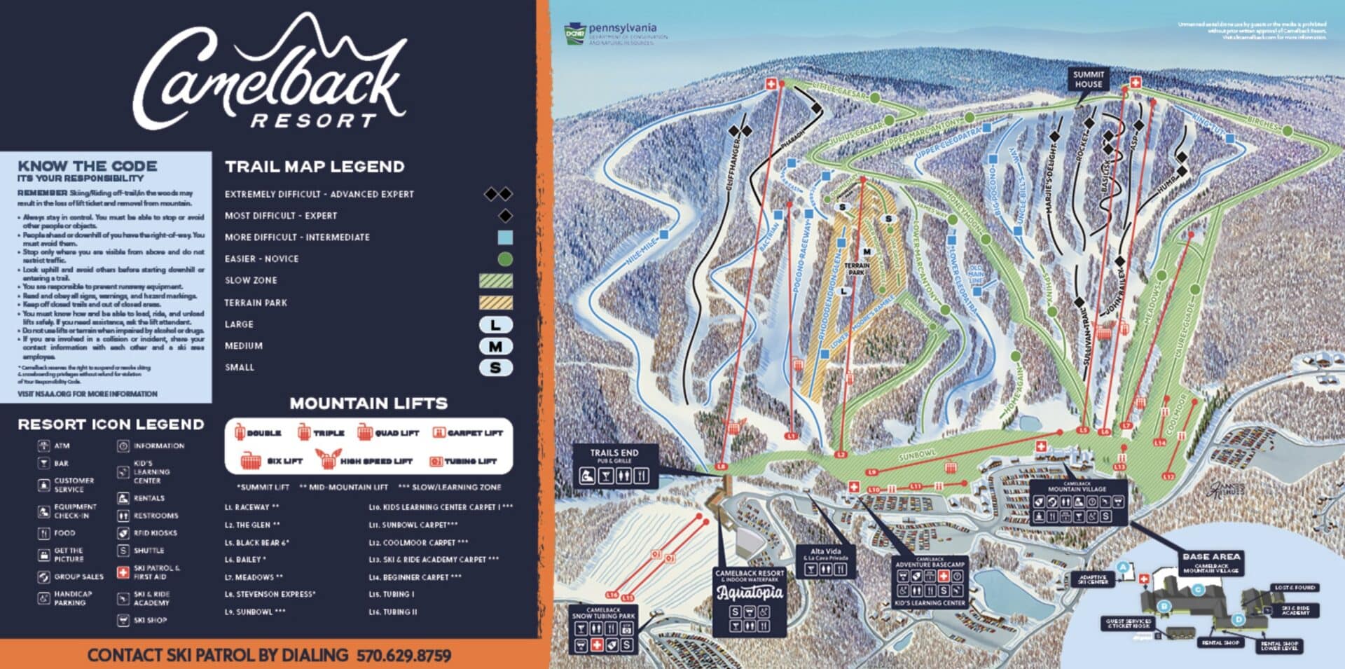 Situated in the Poconos, Camelback has 39 trails and 14 lifts. Its marquee lift is a bubble six-pack chairlift that opened in 2022.