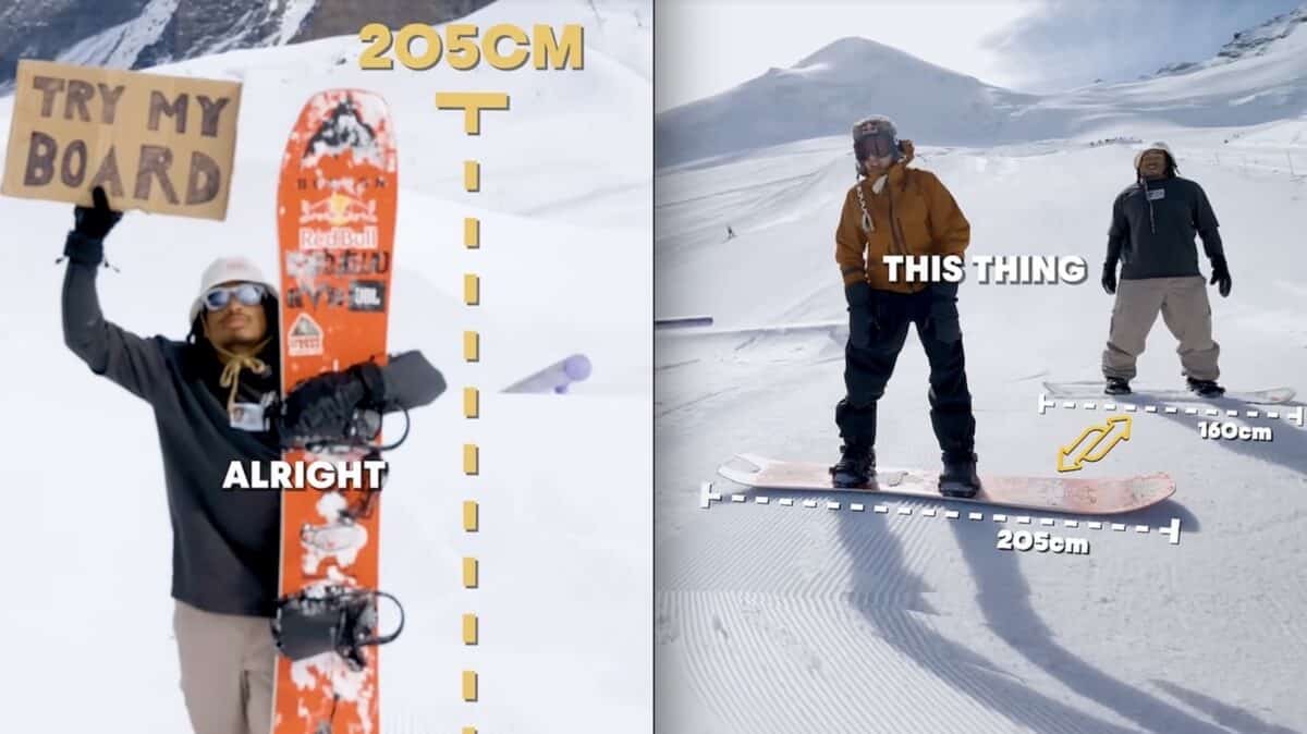 Zeb rides a few different boards, but he’s particularly a fan of riding extra long fish-tail board. A handful of other pro snowboarders gave his 205cm board a shot, and it went pretty much exactly how you’d expect.