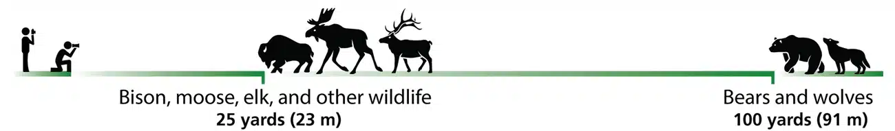 - Always maintain a distance of at least 100 yards from bears and wolves, and 25 yards from other wildlife. Use binoculars or a spotting scope for a good view. Never position yourself between a female and offspring, mothers are very protective. Let wildlife thrive undisturbed. If your actions cause an animal to flee, you are too close.