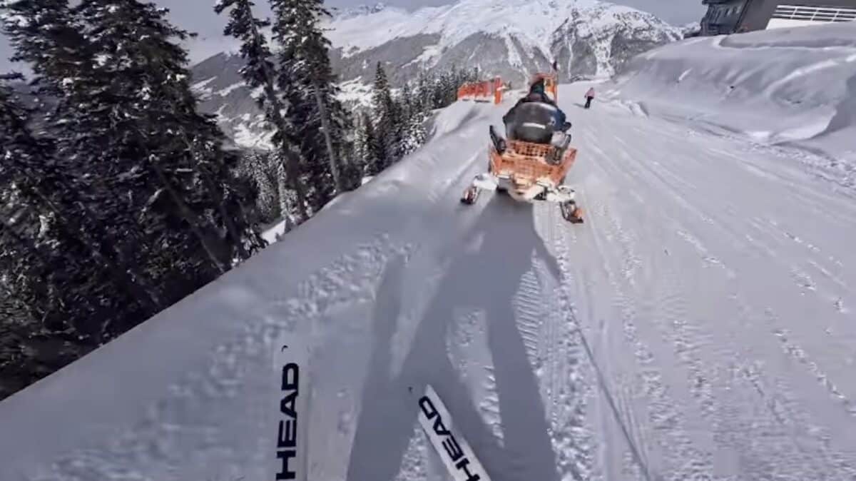 You should be looking around while skiing and you should be aware of where other skiers are in relation to you, so Kieran isn’t at fault for glancing behind him. That said, this clip shows how just a split second moment can quickly lead to disaster if you’re not paying attention. The snowmobile appears to come out of nowhere, you can barely see it before he glances back.