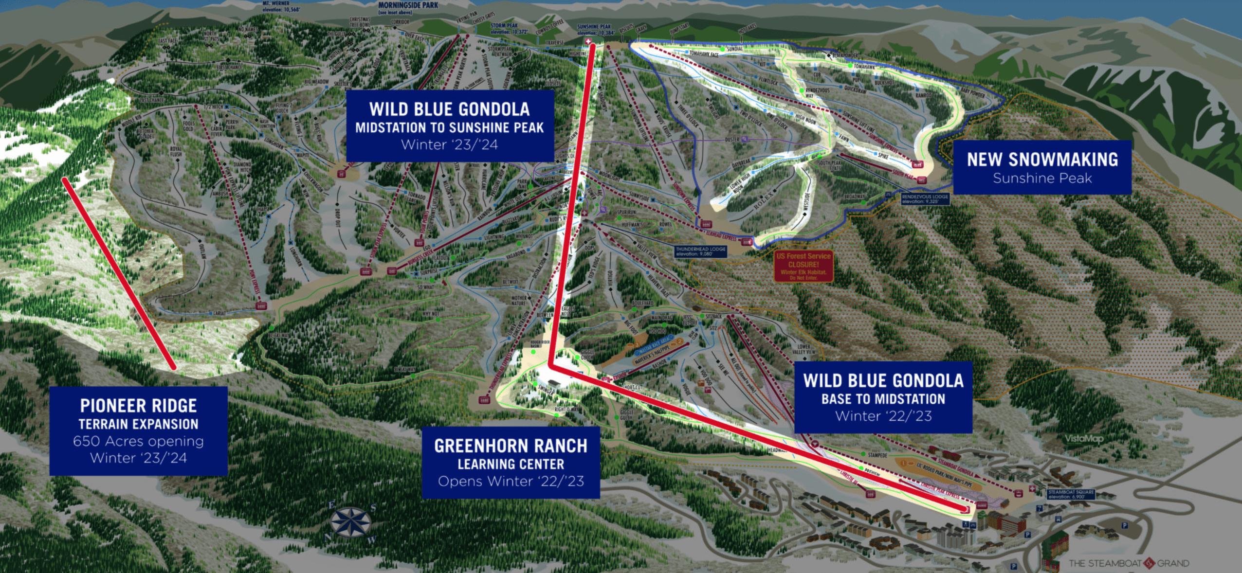 The first phase of the gondola, which will end at the brand-new Greenhorn Ranch beginner area, will open during the 2022-23 season. In terms of construction work done so far, the lower terminal canopy has been completed, tower installation on the lower portion has been completed, and the haul rope installation will begin around the end of September.